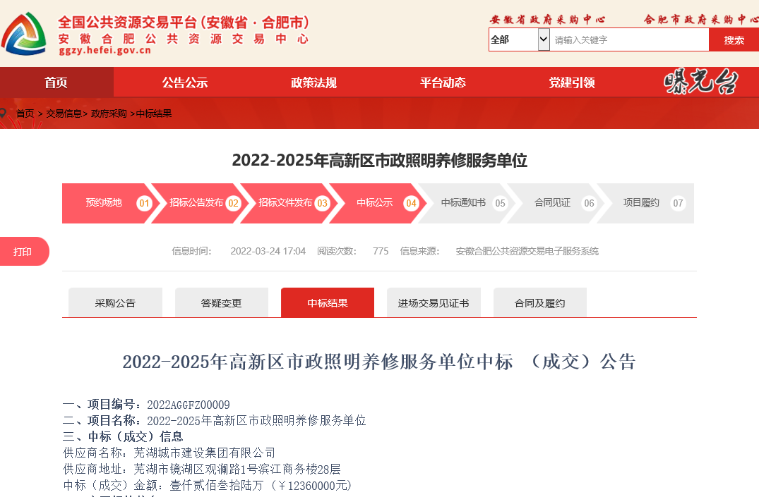 2022年3月24日,集團(tuán)在合肥中標(biāo)“2022-2025年高新區(qū)市政照明養(yǎng)修服務(wù)單位”項(xiàng)目,中標(biāo)價(jià)為1236萬(wàn)元,履約期限為3年,服務(wù)內(nèi)容主要是合肥市高新區(qū)范圍內(nèi)已移交的市政道路路燈、景觀燈、箱變(包含高壓線路)、控制箱等市政設(shè)施日常巡查、管理、養(yǎng)護(hù)、檢修等。